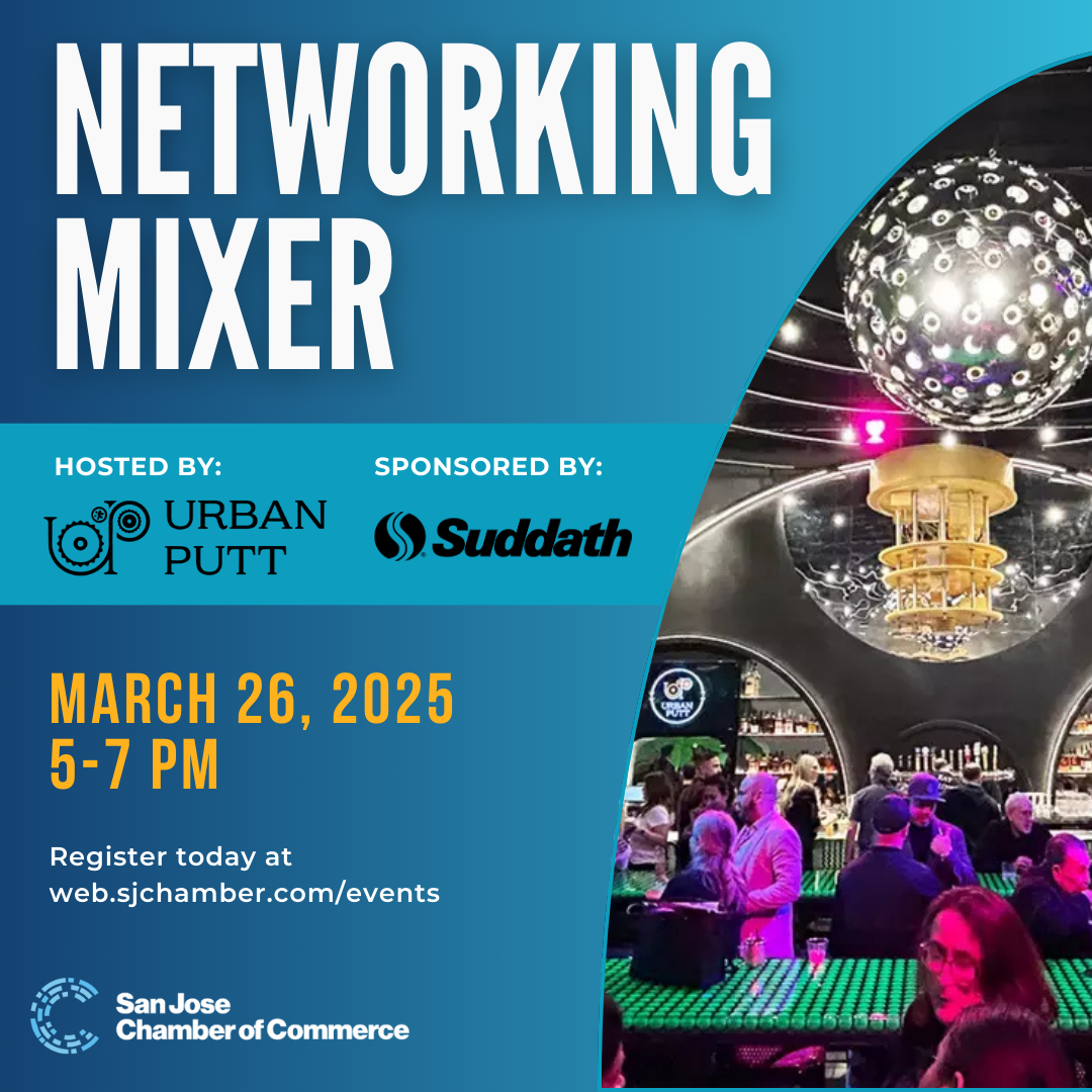 The San Jose Chamber of Commerce invites you to join us for a thrilling evening of networking and fun at Urban Putt! Get ready to tee off into an unforgettable experience at our March Mixer Event sponsored by Suddath and hosted by Urban Putt, where we'll drive home the excitement with every swing!