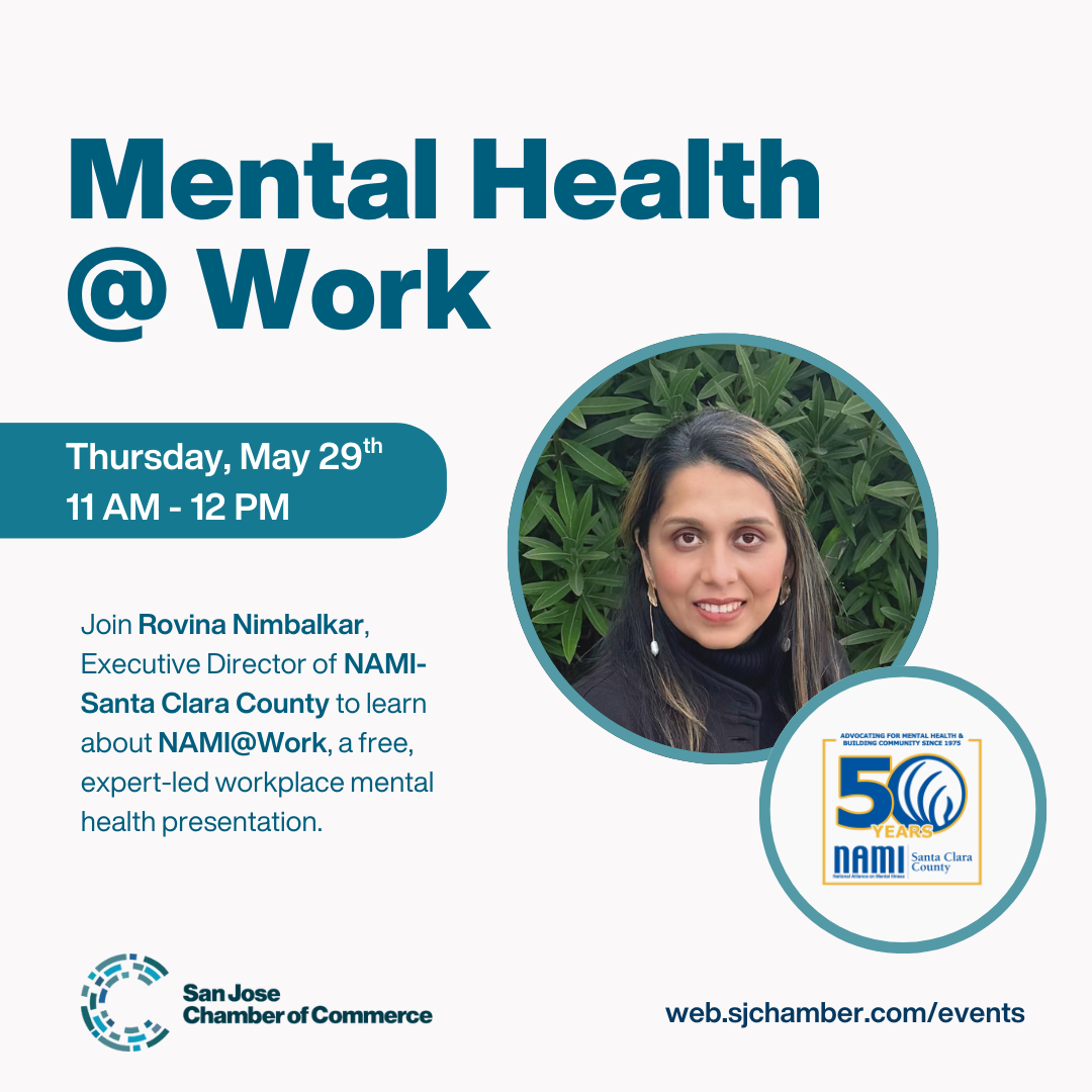 Join the San Jose Chamber of Commerce for an exclusive brown bag lunch and learn session with Rovina Nimbalkar, Executive Director of NAMI-Santa Clara County. This event is designed for Chamber members to learn about NAMI@Work, a free, expert-led workplace mental health presentation offered by the National Alliance on Mental Illness (NAMI).