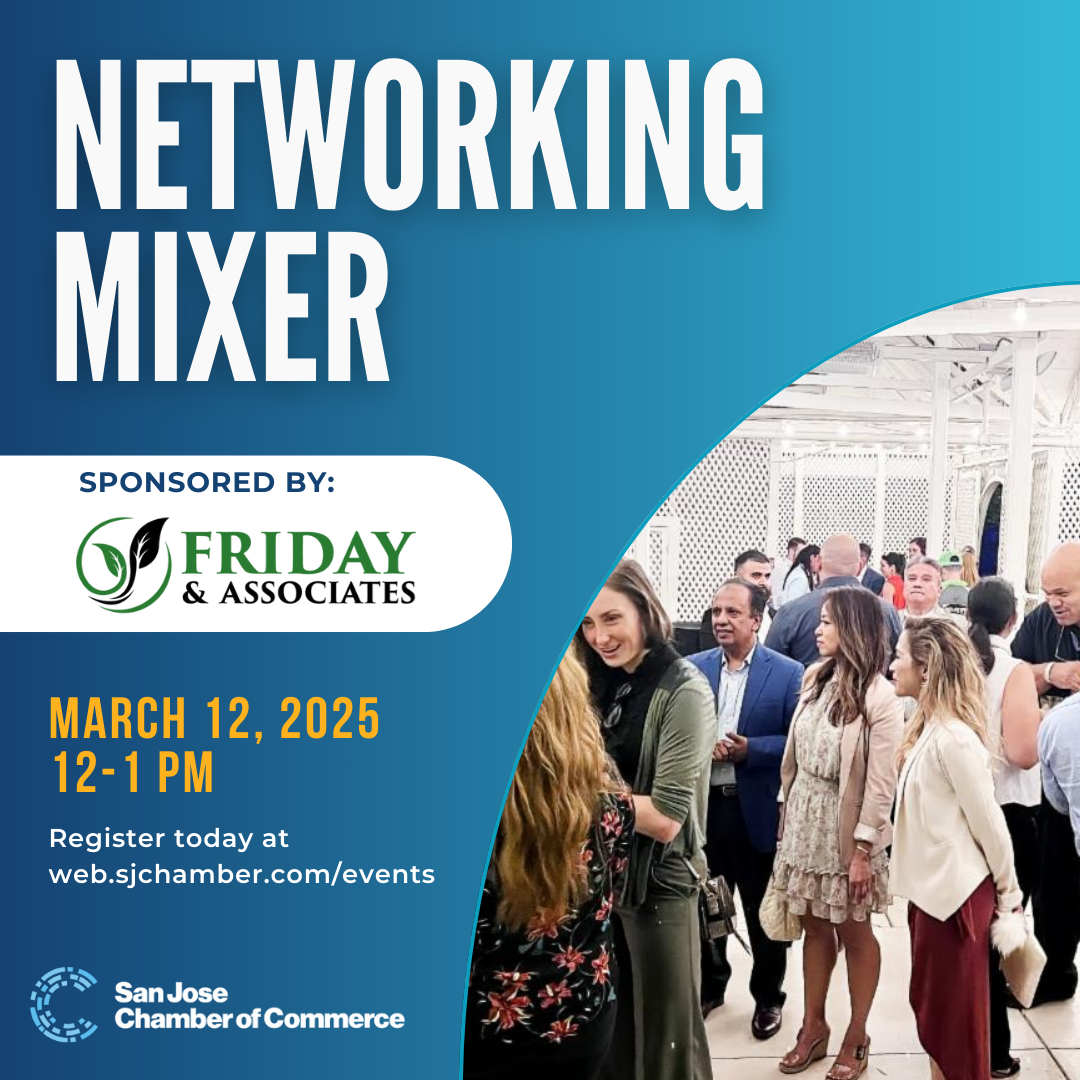 Join us for a networking mixer at the San Jose Chamber sponsored by FRIDAY & Associates. Come meet like-minded professionals and get to know Chamber members. Light bites and refreshments will be served. Pre-registration is required as space is limited. Stay until the end for your chance to win a raffle prize.