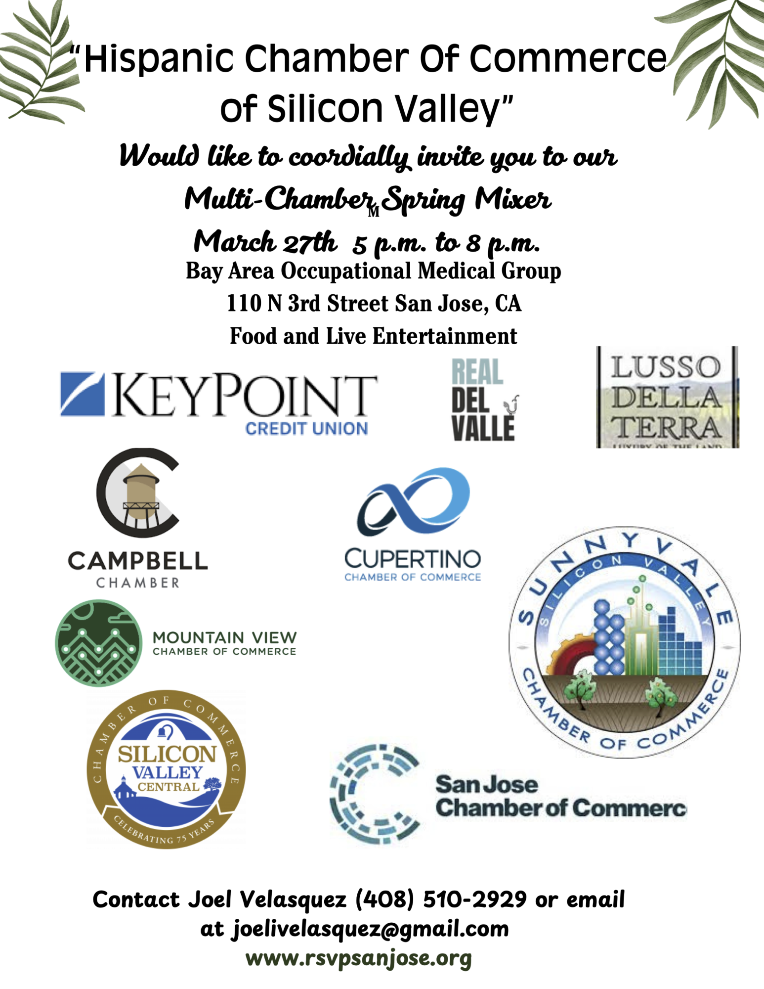 You're invited to a multi-Chamber Mixer hosted by the Hispanic Chamber. Numerous Bay Area Chambers will be participating, including San Jose, Campbell, Cupertino, Sunnyvale, Mountain View, and Silicon Valley Chambers. Food and live entertainment. No advance registration is required. If you have questions, please contact Joel Velasquez at joelivelasquez@gmai.com.
