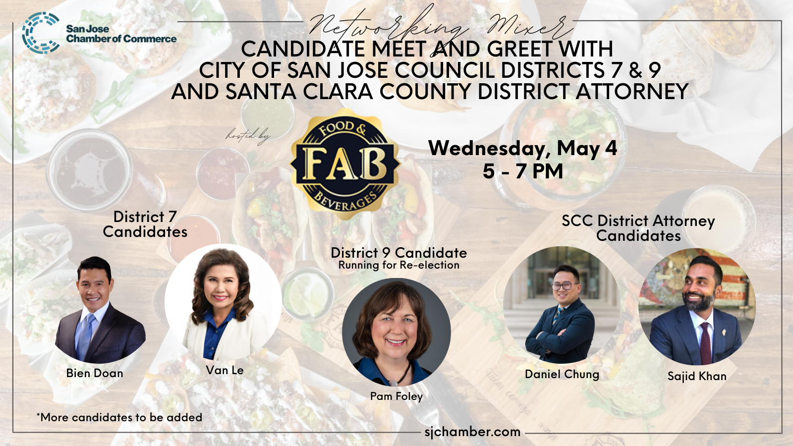 Join us for networking and a meet and greet* of the candidates who are running for San Jose Council Districts 7 & 9 and Santa Clara County District Attorney.