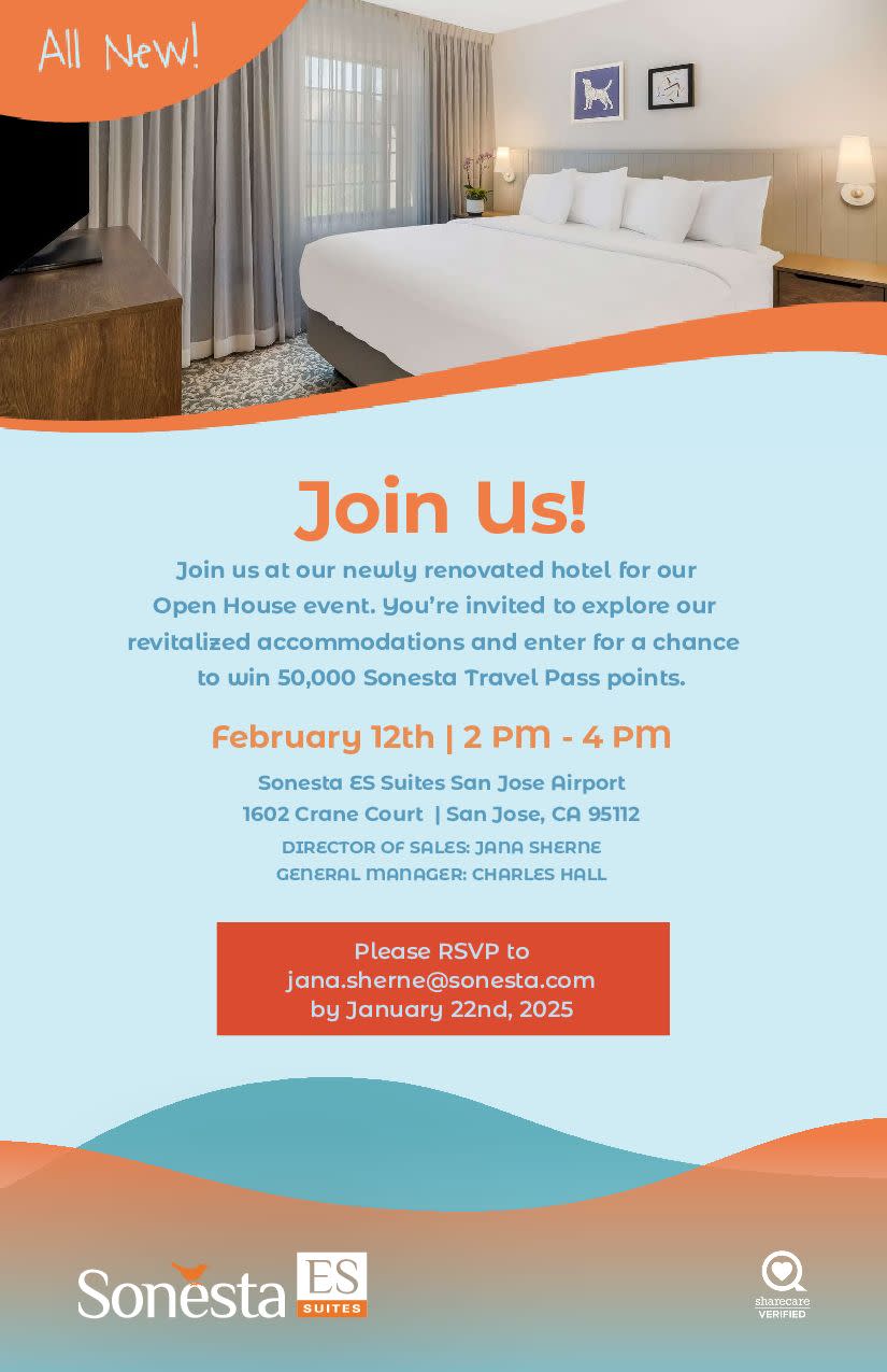 Join us at the newly renovated Sonesta ES Suites Open House and Ribbon Cutting. You are invited to explore the revitalized accommodations and enter for a chance to win 50,000 Sonesta Travel Pass points.