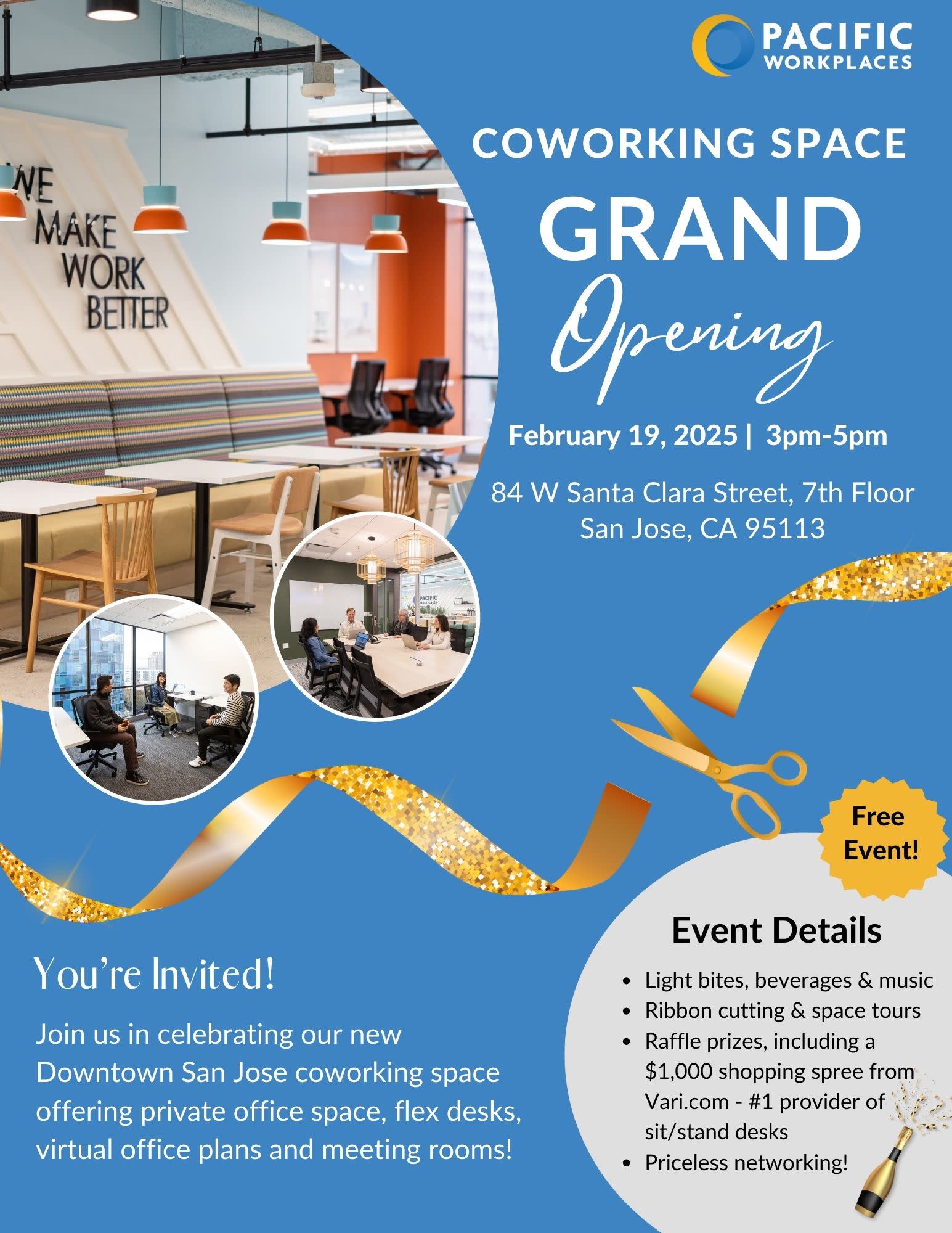 You are invited to join us at our new downtown San Jose coworking space at Pacific Workplaces. We offer private office spaces, flex desks, virtual office plans and meeting rooms. Join us for a full program of activities with light bites, beverages and music. Raffle prizes, including a $1,000 shopping spree from Vari.com - the #1 provider of sit/stand desks. | ![]() |
