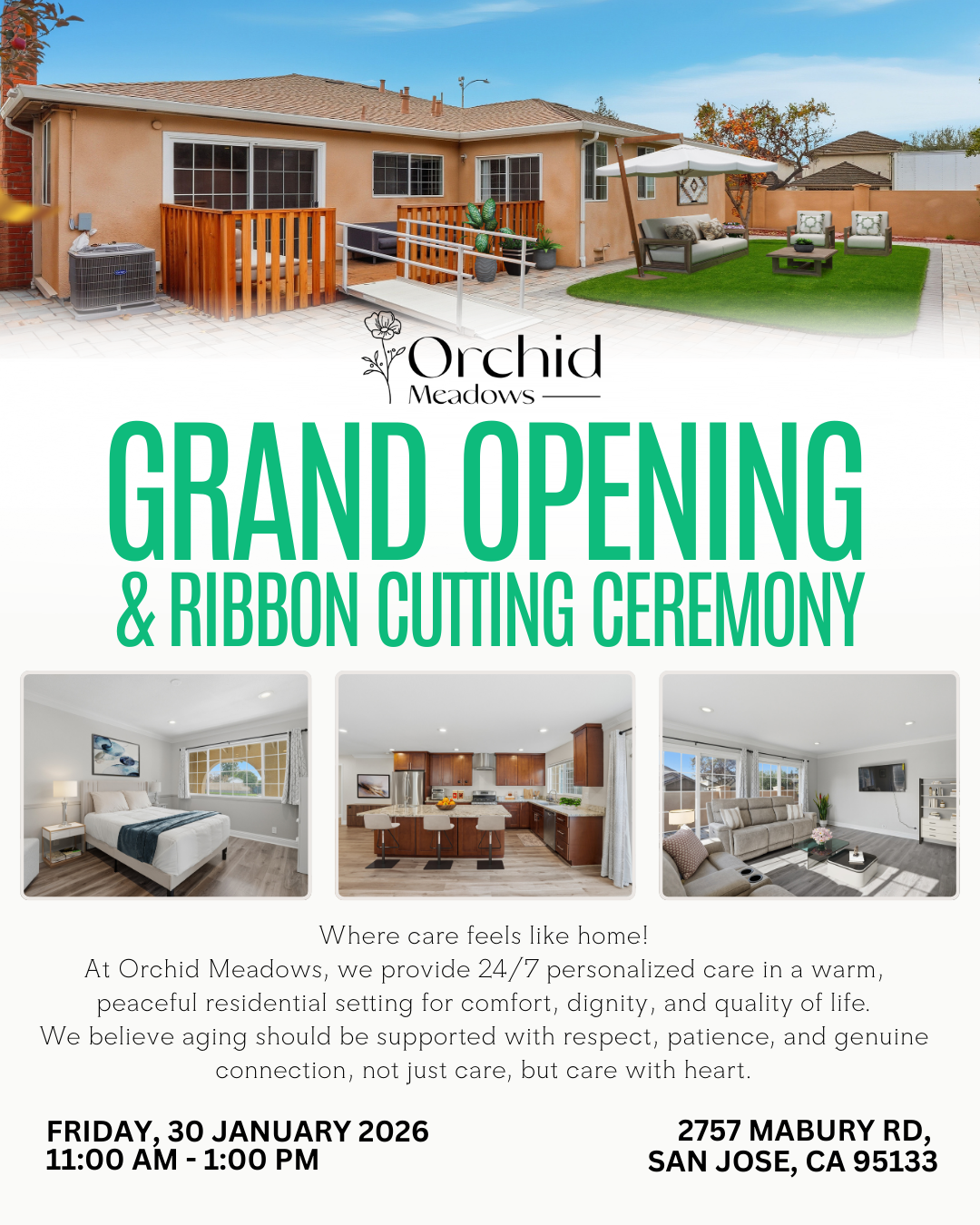 You are invited to join us for the Grand Opening and Ribbon Cutting Ceremony celebrating Orchid Meadows Senior Care Home, a newly opened and fully licensed 6-bed Residential Care Facility for the Elderly in San Jose.