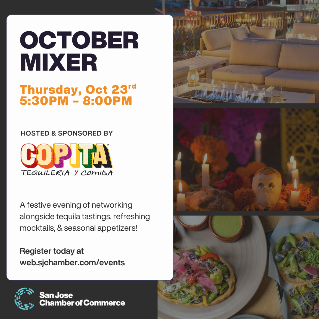 You’re invited to a lively evening of connection, flavor, and community at our October Chamber mixer, hosted and sponsored by Copita Tequileria y Comida in the heart of Willow Glen.